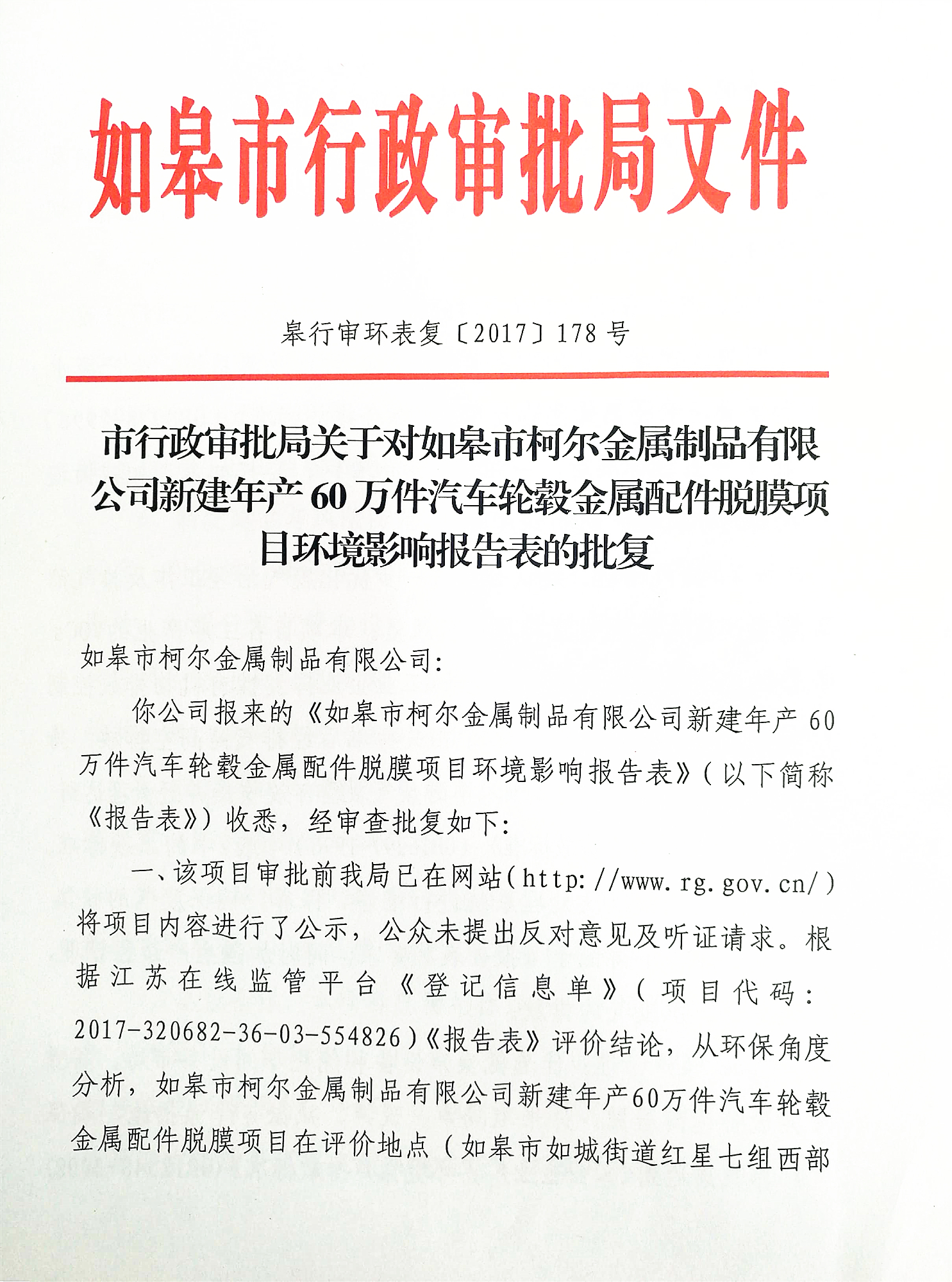 如皋市柯爾金屬制品有限公司成立于2017年,位于如皋市紅星西部工業園區。主要從事于汽車輪轂脫漆,各種規格金屬管件、大件脫漆 、平面脫漆  、槽罐脫漆 、 船舶脫漆  、各規格的金屬密封件橡膠剝離。我公司可以根據客戶的不同需求,提供優質、高效的服務。本公司環評、驗收、排污等手續齊備,危廢、污水合法處置;污水處理、廢氣收集設備運轉齊全。